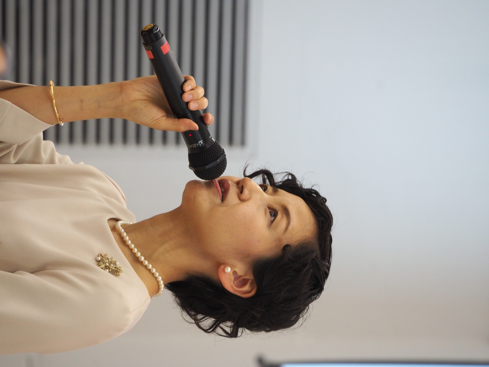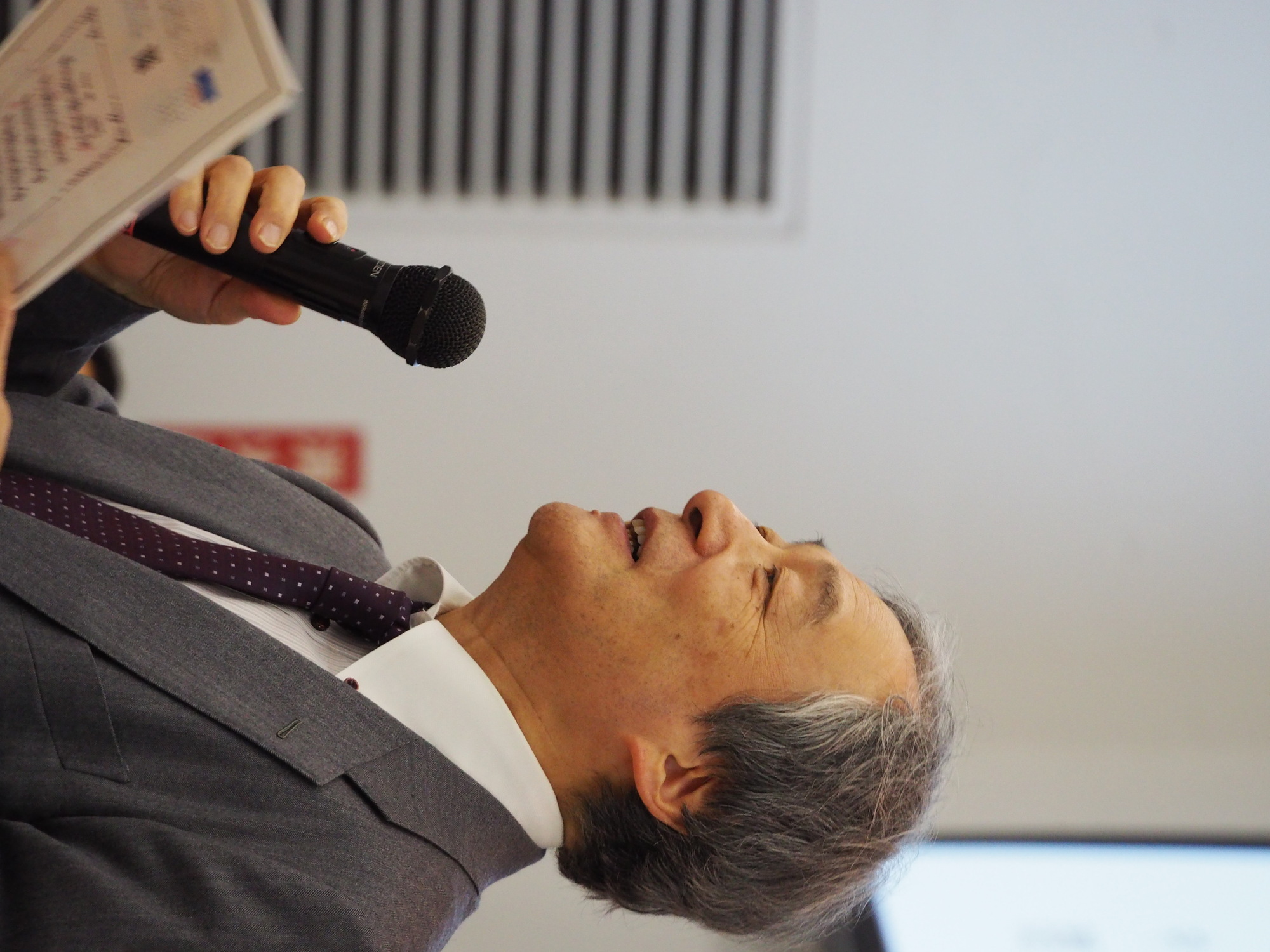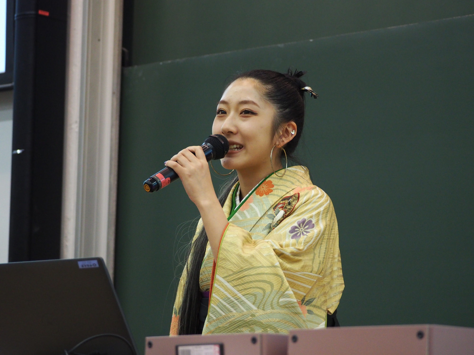 壇上で歌う矢野先生とゼミ学生