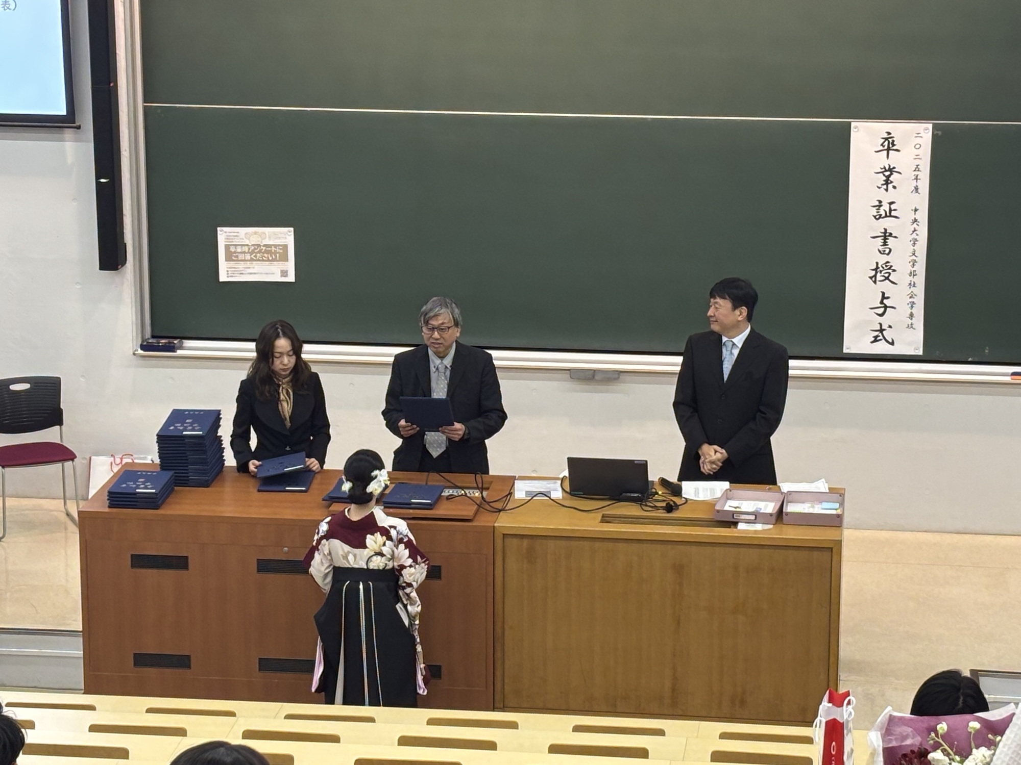 第一体育館での式典の終了後、文学部では専攻毎に卒業証書授与式を行いました。